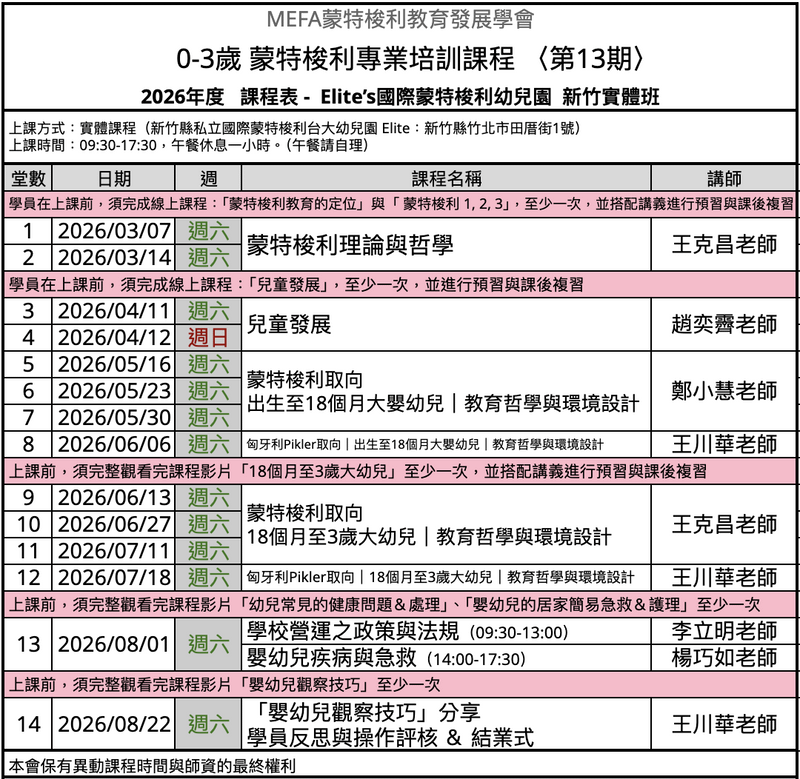 - 此費用己包含上述實體/直播課程費用+課程期間影片觀看費用,並贈送MEFA講義(開課前一周寄出);學員完成線上& 實體課程、並通過MEFA評核以後,始核發MEFA蒙特梭利教育發展學會頒發之證書。