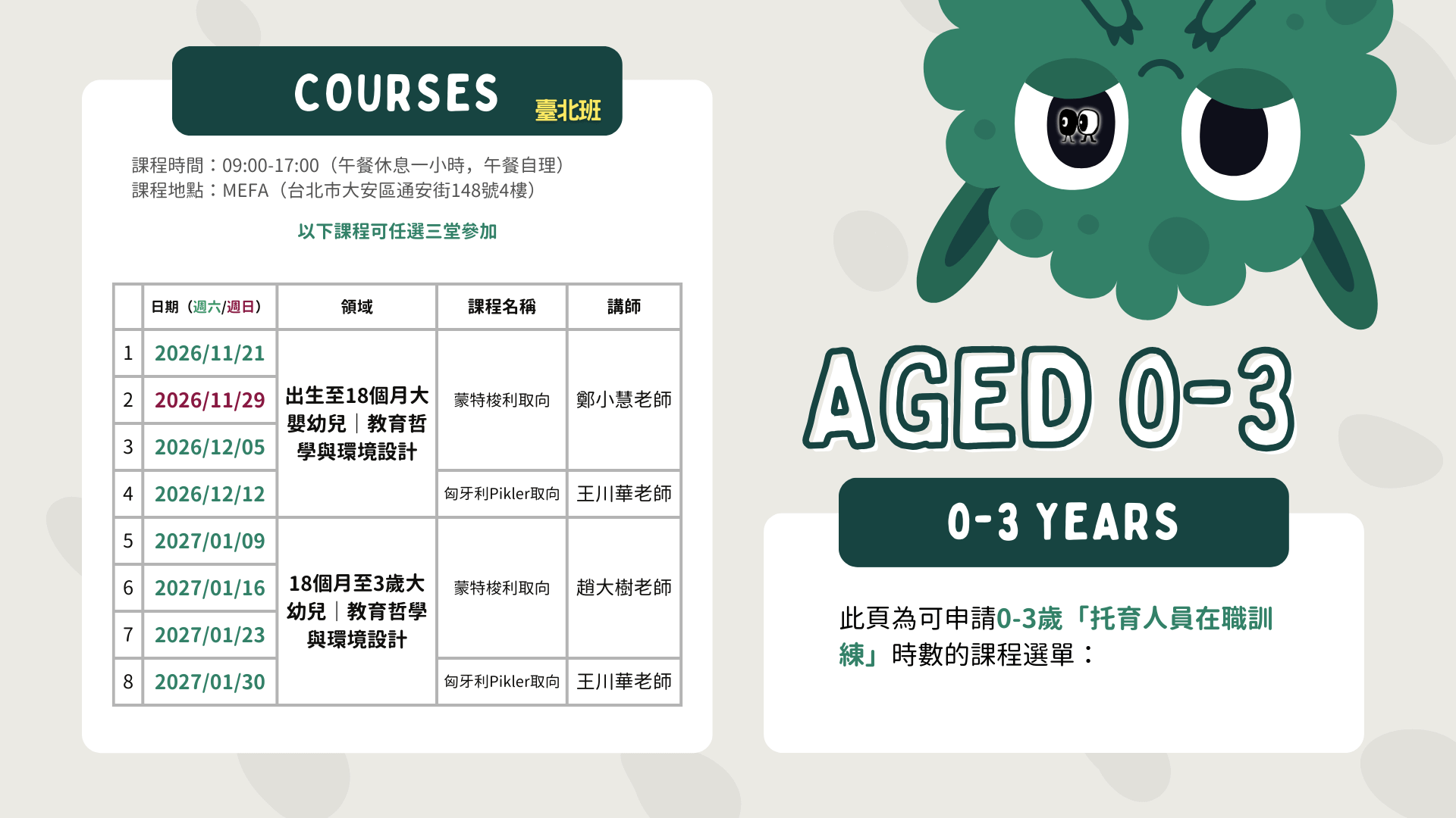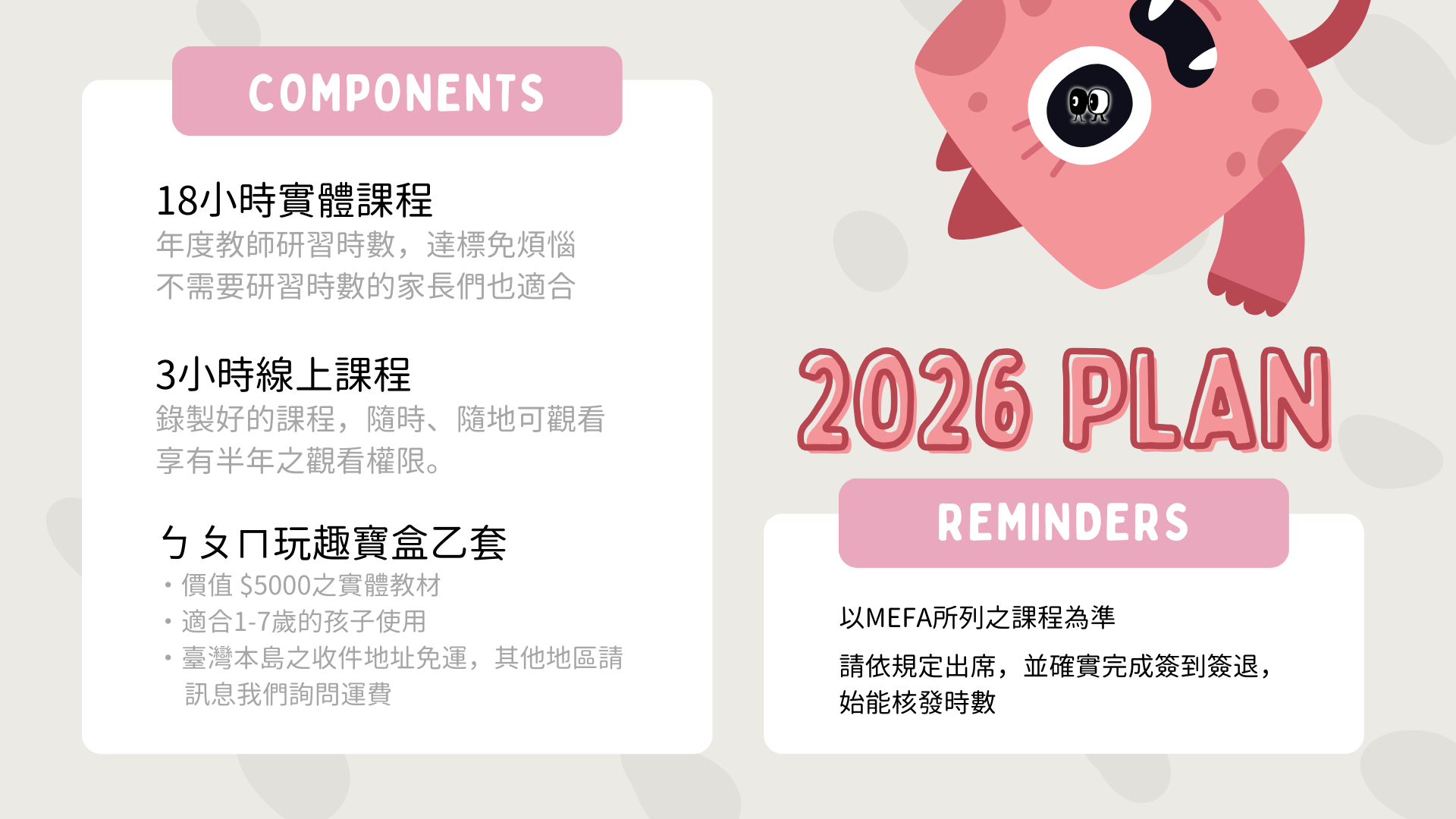 - 改期補課: 若課程因 MEFA 因素(如講師行程變動或天災)而改期,導致您無法參與,您可選擇在下一年度免費補上該次課程。