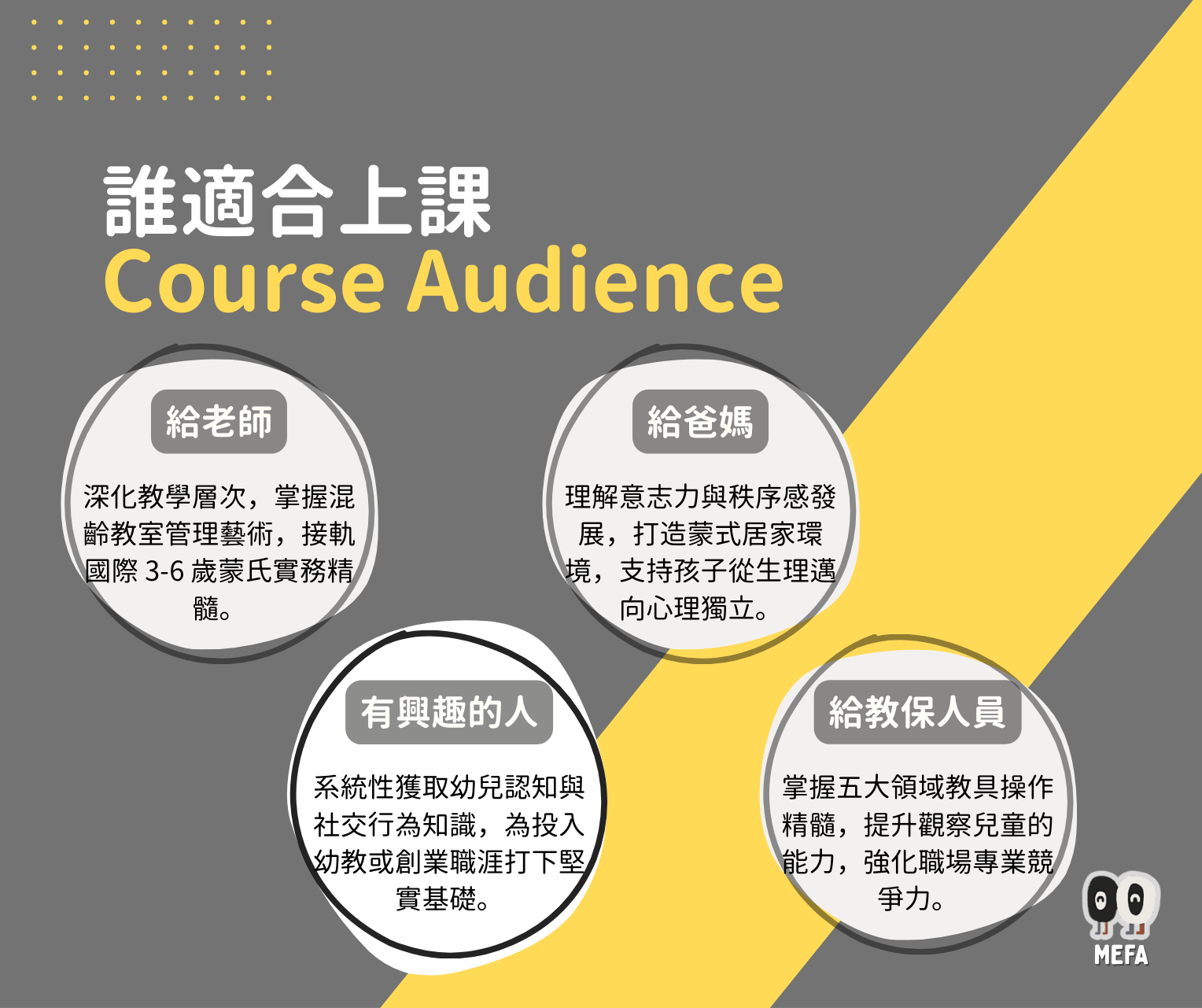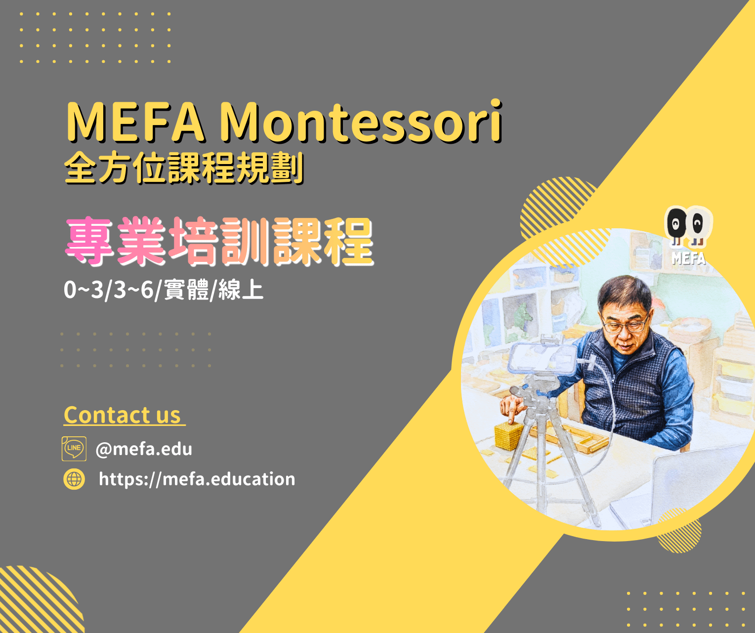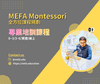 - 此費用己包含上述實體/直播課程費用+課程期間影片觀看費用,並贈送MEFA講義(開課前一周寄出);學員完成線上& 實體課程、並通過MEFA評核以後,始核發MEFA蒙特梭利教育發展學會頒發之證書。