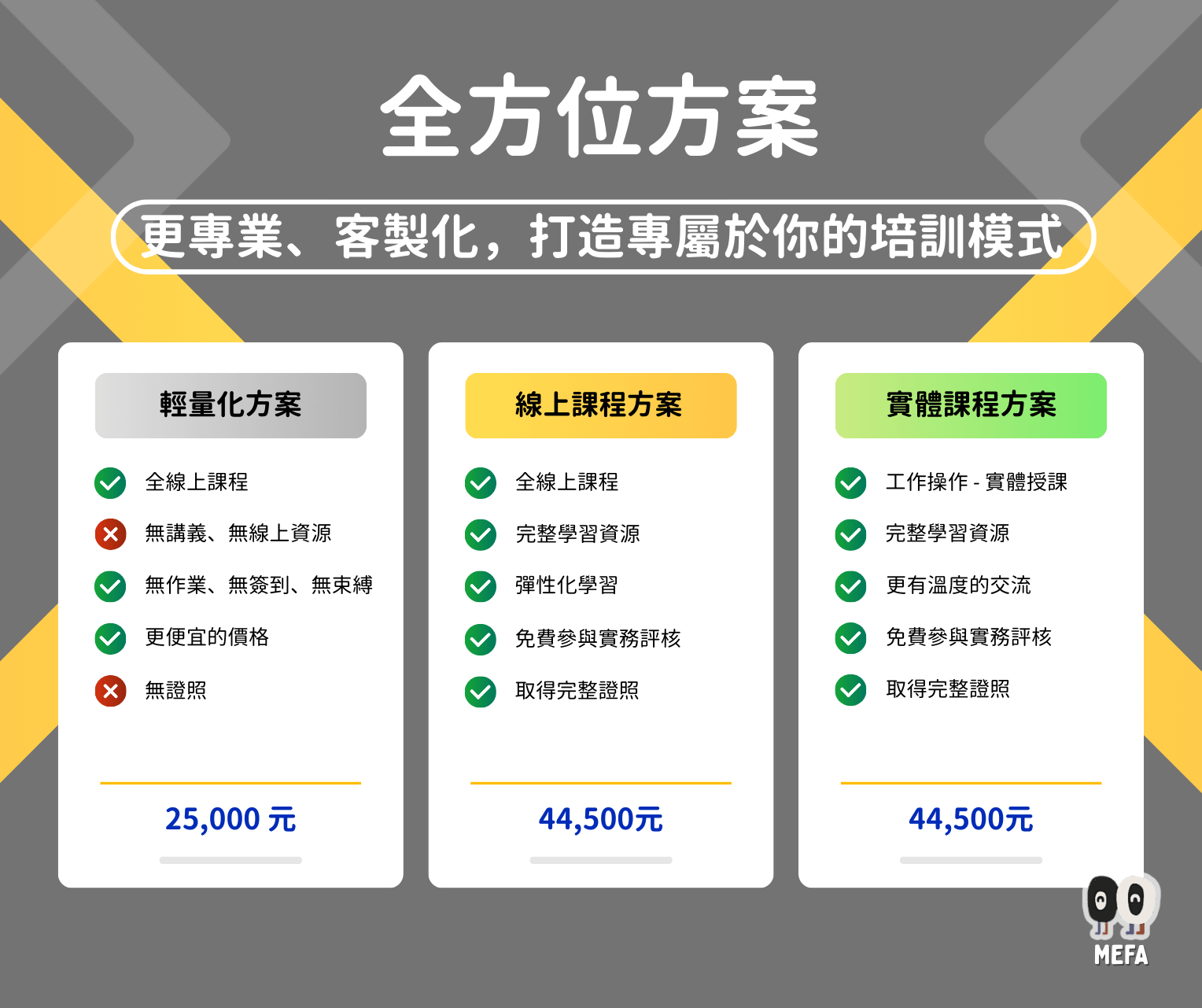 - 課程結業會核發結業證書。請特別注意,證書上會載明受訓總時數&學員實際參與課程的出席時數。若有補課及重新發證之需求,MEFA可於學員補課完畢後重新製作並補發證書,重新補發證書之工本費為1000元/份。(學員缺課、需要補的課程請自行紀錄、或是透過課堂現場的簽到表查詢,MEFA恕不代為查詢)