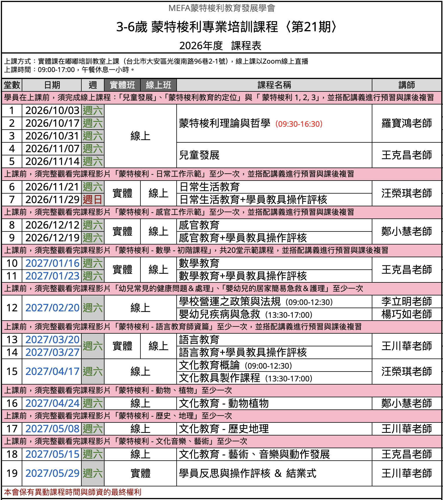 2. 報名「線上班」的學員:為全線上授課,不能交替選擇「實體」上課(唯有2027/5/29為實體上課)。