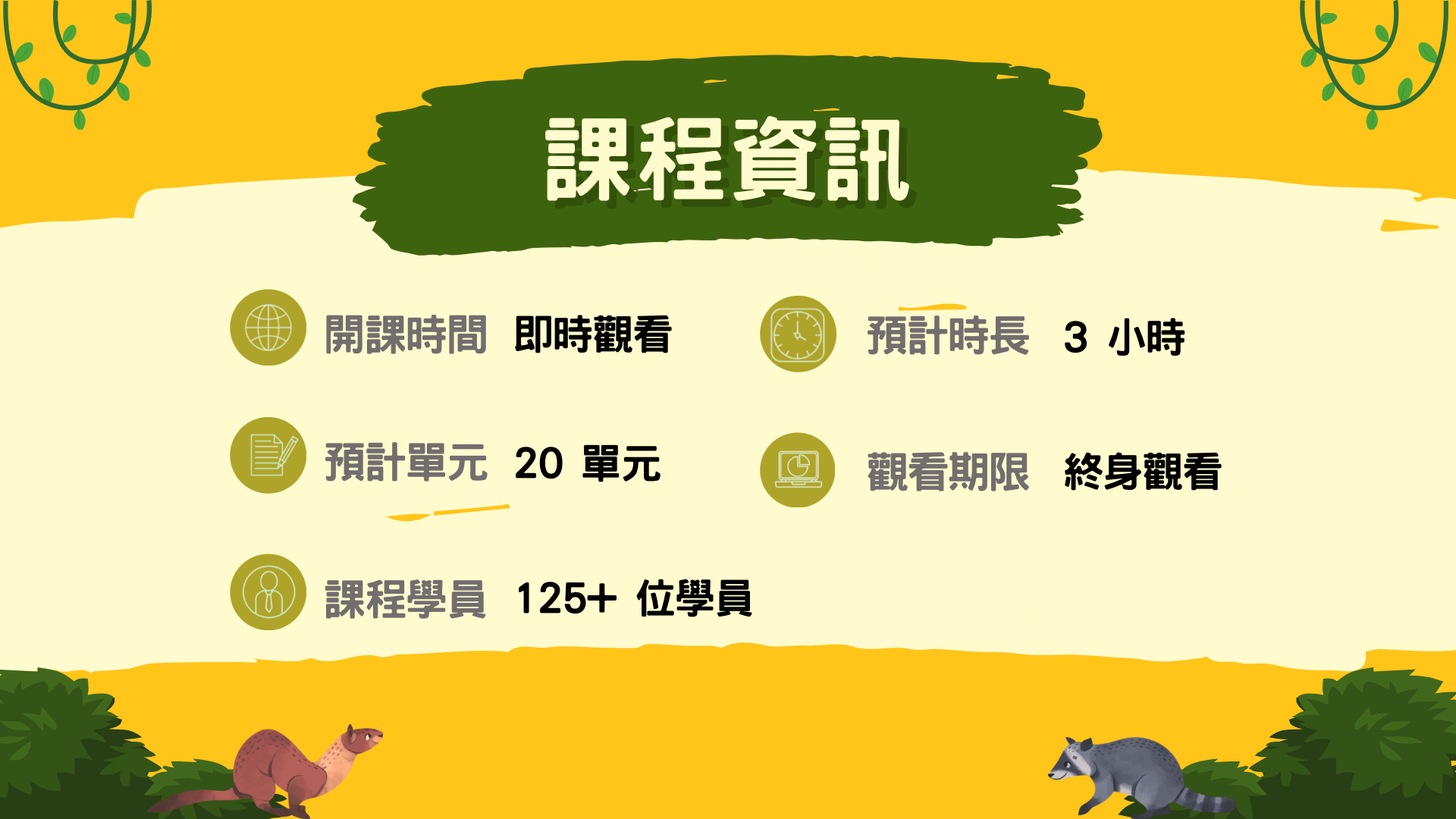 課程內容共 21 個單元•總時數約 3.3 小時