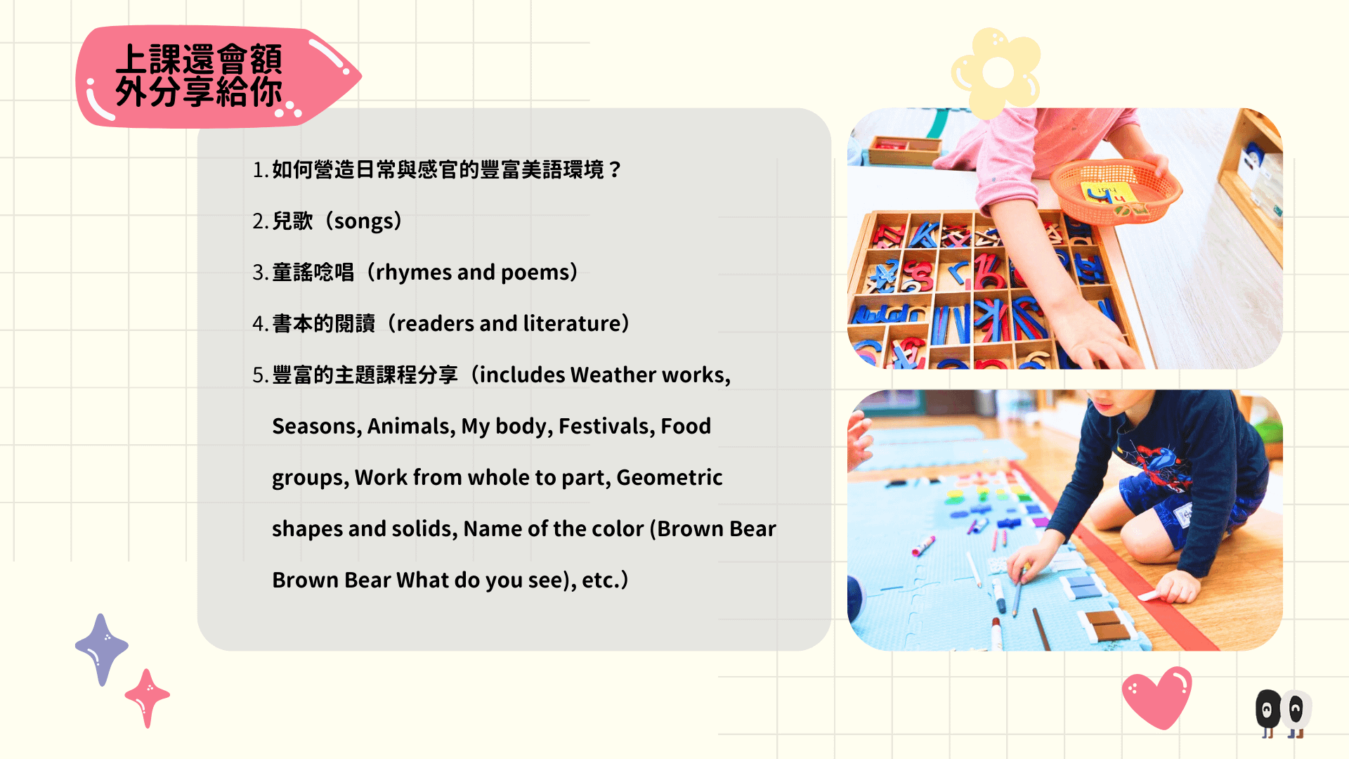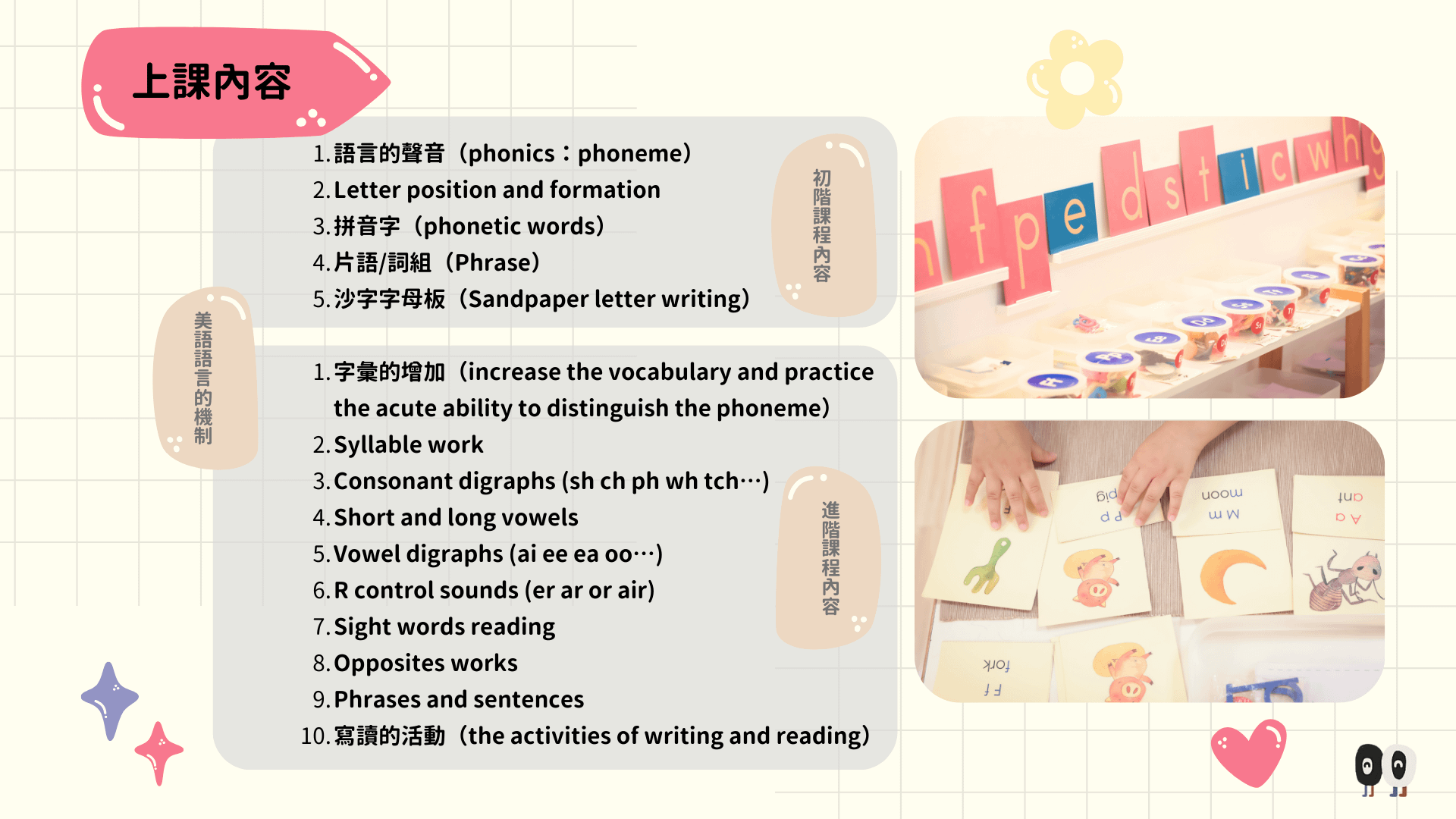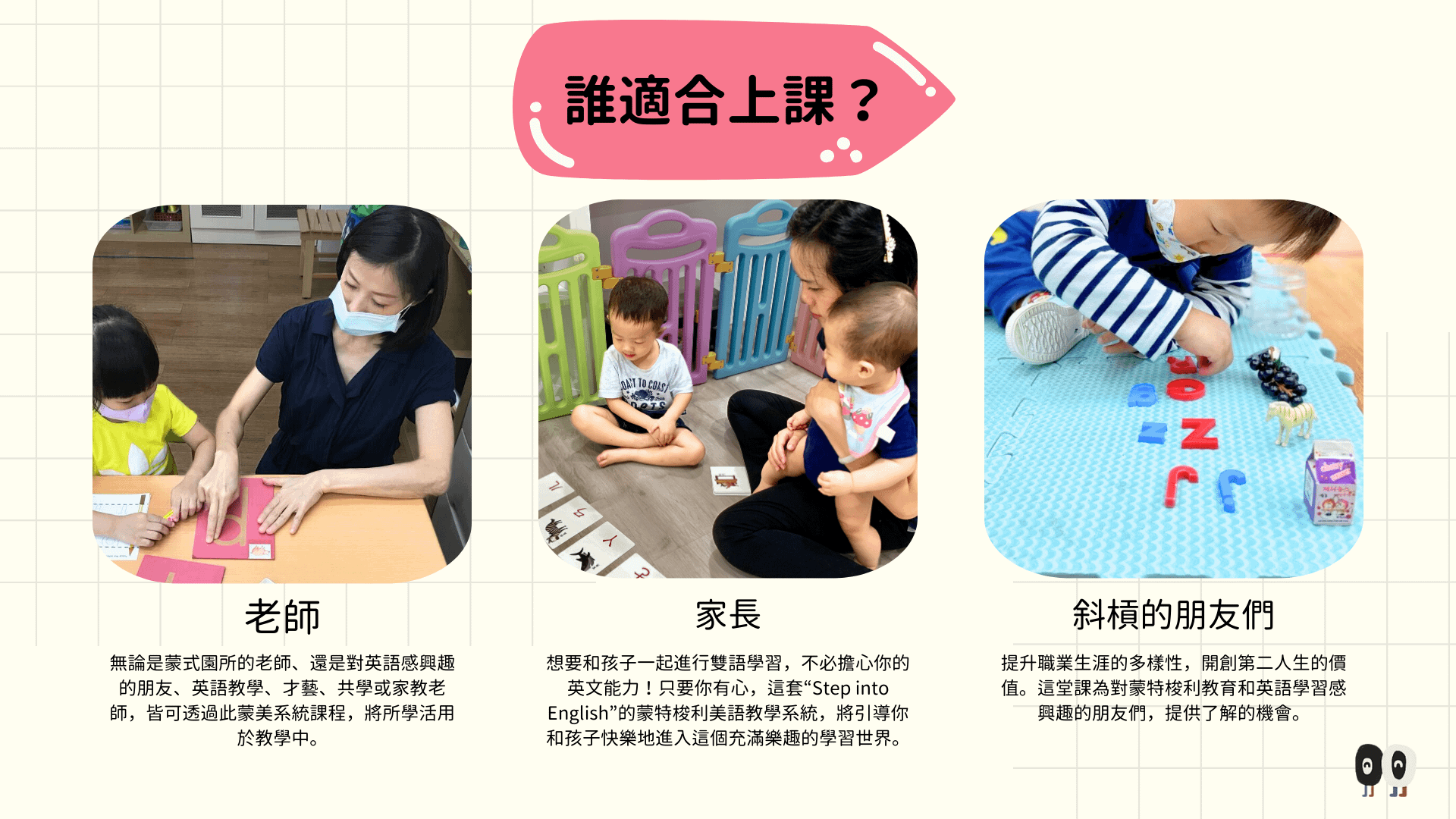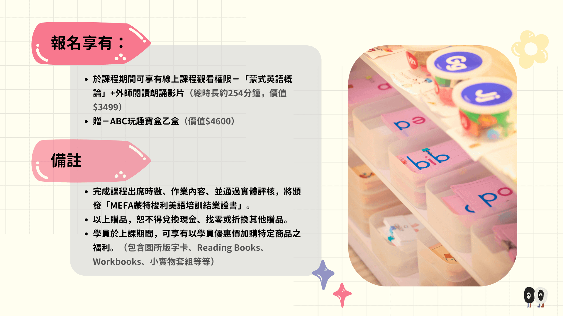 *實體&線上差異在於,實體可實際體驗蒙式相關教具工作、實際操作,並觀察蒙式教室美語環境的預備。