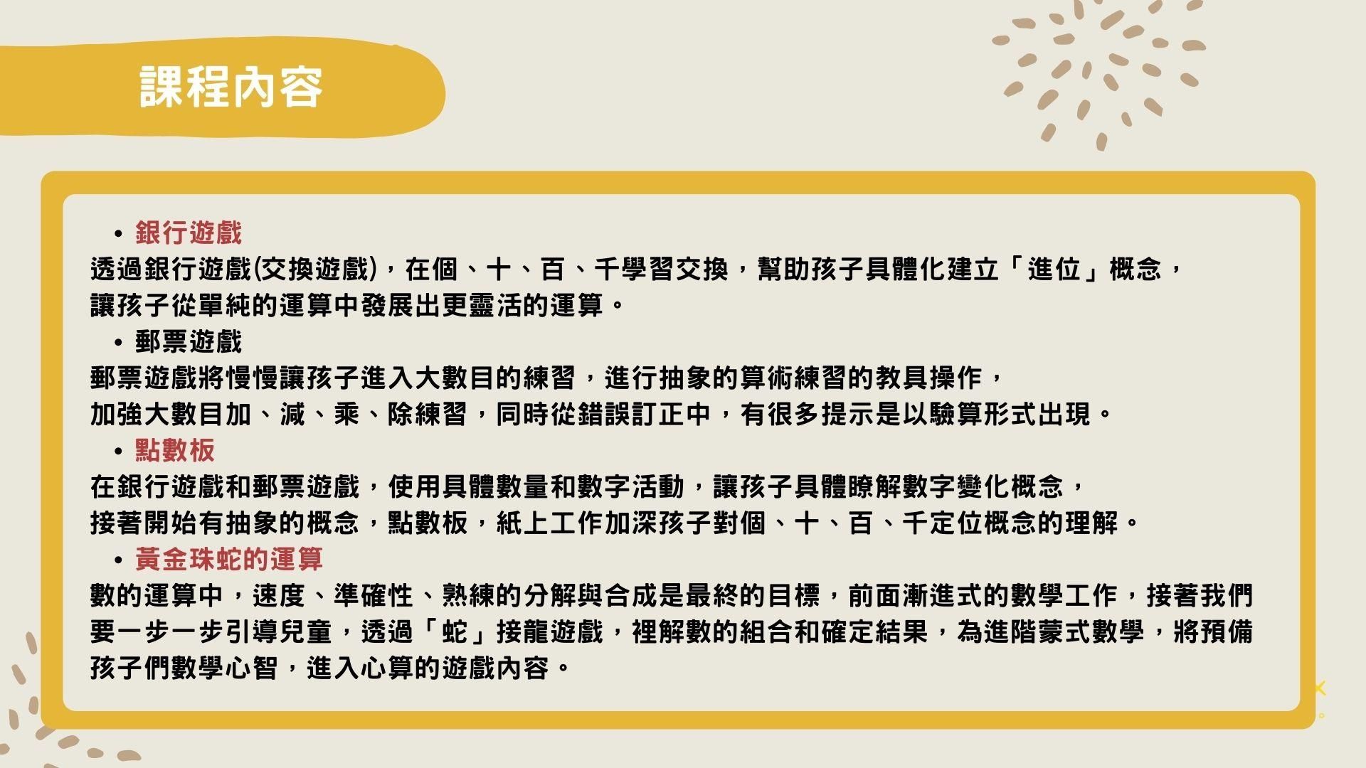 為了自身孩子的成長學習、踏入了幼兒教育, 認識了蒙特梭利教育理念,從而深耕於蒙式教育至今30多年。 親眼見證孩子在蒙式學習環境下的成長與變化。 在每雙閃閃發亮的小眼睛裡,看到了幼兒發展的無窮潛力, 更看到了「自主快樂學習」可以自然而然地發生在每位孩子身上。 希望未來能持續的陪伴孩子、跟隨孩子, 並且引導成人一起看見孩子真實的樣貌。