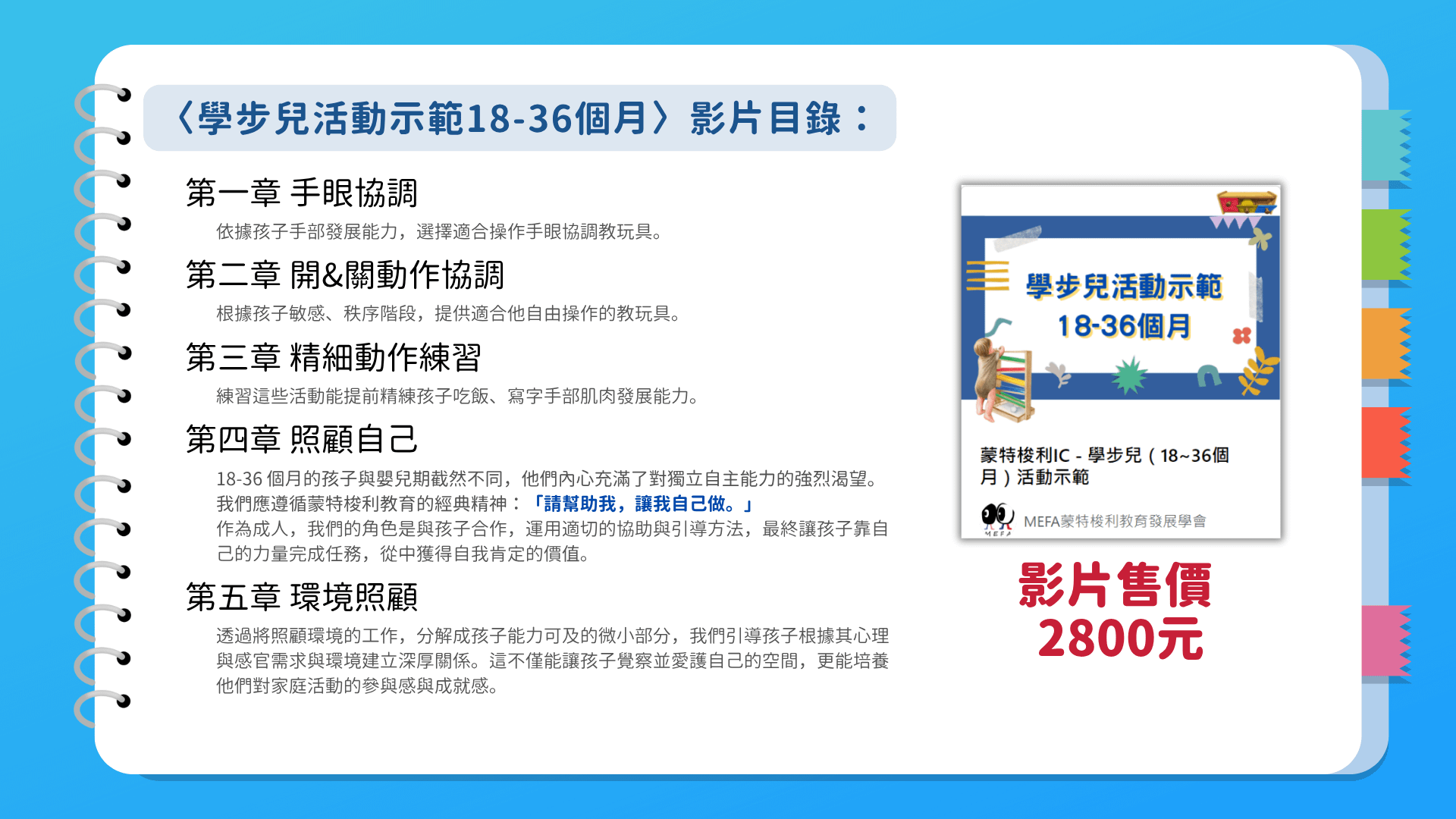 ▶一課程:蒙特梭利IC - 學步兒(18~36個月)活動示範線上影片(下單後約2-3個工作天授權一年之觀看權限)