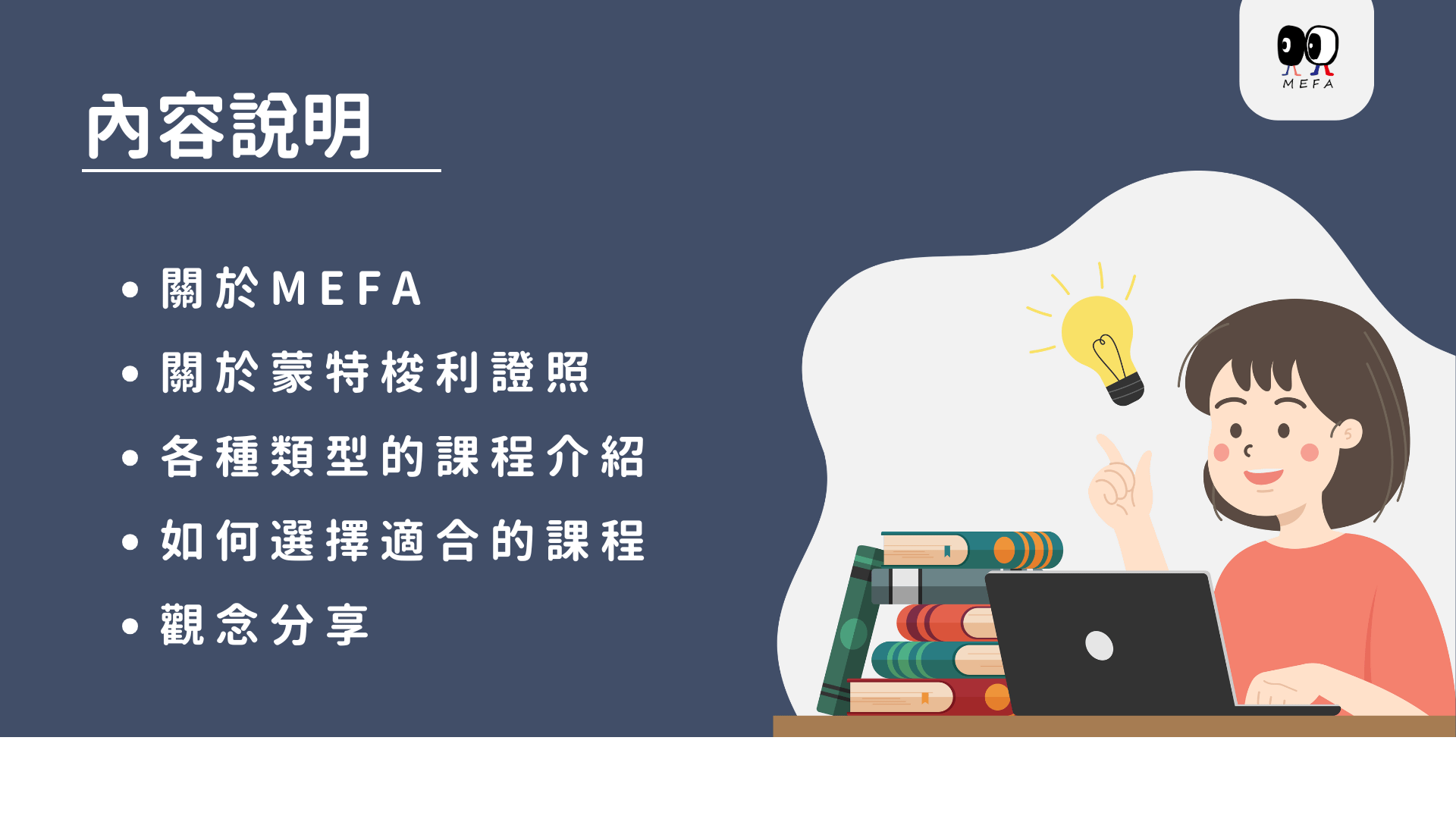 - 在線上的課程諮詢當中,我們會簡介課程的資訊,主要會將時間留給大家做提問與討論。建議可以先觀看我們的免費線上說明會內容,對於現場的討論會更有幫助喔。 課程連結:https://mefa.education/courses/admissionseminar
