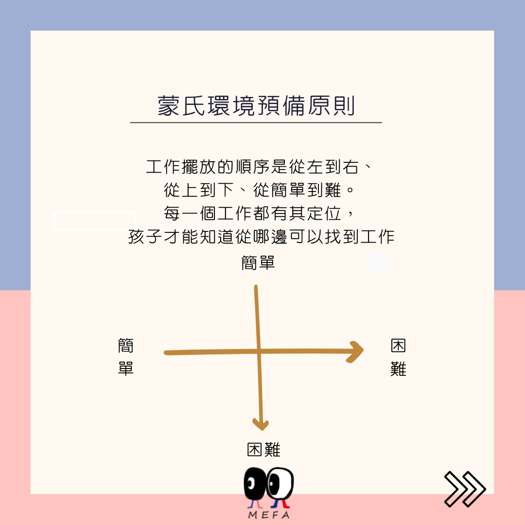 在環境預備上,我們工作擺放的順序是從左到右、從上到下、從簡單到難。每一個工作都有其定位,孩子才能知道從哪邊可以找到工作,知道如何把工作定位,知道每一個工作擺放的原因,知道完成這一個之後可以往後去挑戰更難一點的工作。