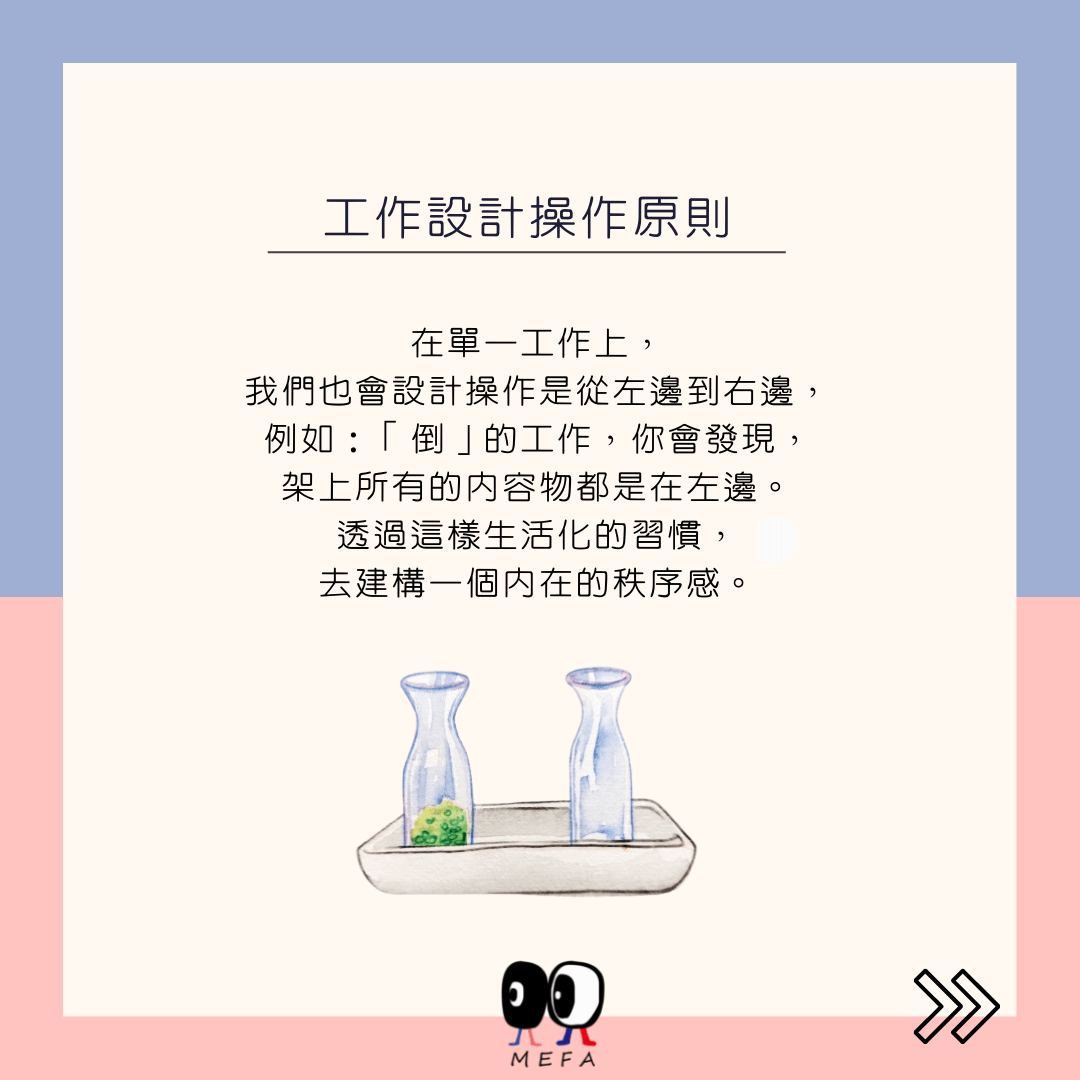 在單一工作上,我們也會設計操作是從左邊到右邊,例如:「倒」的工作,你會發現,架上所有的內容物都是在左邊。我們在做色版盒顏色比對的時候,也是兩個顏色左右放置比對。這些工作設計,都是潛移默化的讓孩子去建構從左到右的概念。甚至是我們在幫孩子穿鞋子、穿襪子,都會說先左腳、在右腳,透過這樣生活化的習慣,去建構一個內在的秩序感。