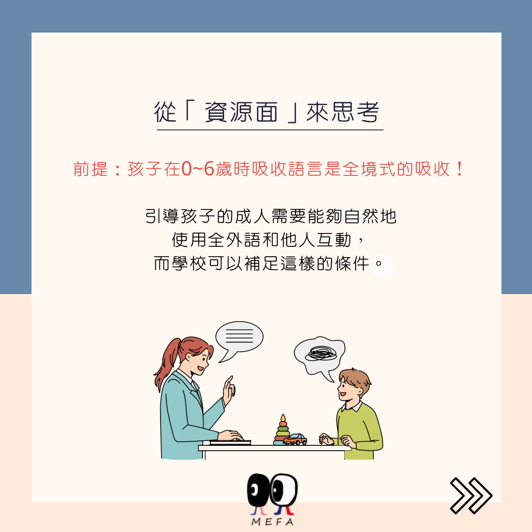從資源面來看,如果你們家庭中可以有一位成人使用全外語,那你基本上擁有雙語的環境。我們常常說 one face one language,因為孩子在0~6歲時吸收語言是全境式的吸收,所謂全境式吸收包含語意、語用、語法、語句、語音等內容。而這也是雙母語以及第二外語的很大區別。這位成人要很自然地在環境中使用全外語的模式在和所有人互動,所以這是先決條件之一。雙母語、以及流利的第二外語,最大的區別來自資源面的部分,當然若在雙語的學校,至少在學校期間是可以補足這樣的條件的。