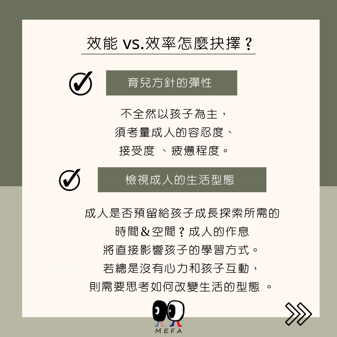 我自己在執行這些模式的時候,一直都秉持著一個觀念,就是照顧孩子或是教育、教養孩子,不會全然是以孩子為主,一定需要考量成人的容忍度、接受度還有很重要的疲憊程度。