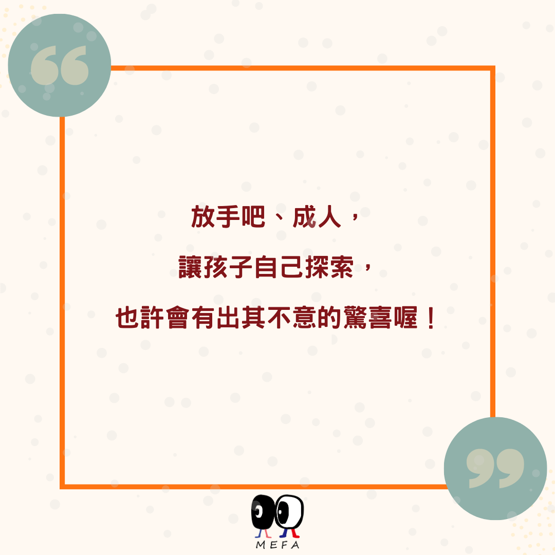 我們常常會說、當孩子碰到狀況時,先緩一緩,觀察孩子如何應對,其實多半成人都不需要介入,孩子總能找到辦法去解決。這也是建構孩子獨立思考以及回應環境的模式。