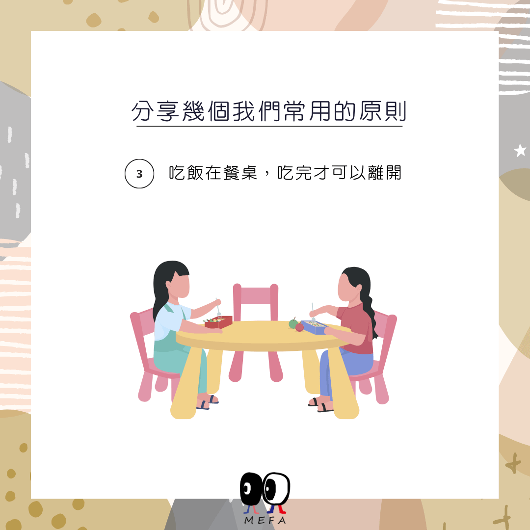 這是基本的餐桌禮儀,吃完飯才可以離開,也同步想帶給孩子專心做一件事情的概念。