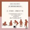 運動的重點是「支撐面」的面積越大,整體協調就越平穩。出生時仰躺、全背全身為支撐面,坐著時臀部為主要支撐,站著時支撐面轉為腳。人的支撐面越來越小,必須感受身體重心(重力點)在哪裡,重心越靠近支撐面感受越平穩,越能平衡身體。平衡運動最重要的發展在於:靜止或運動狀態時都需要感受重心與支撐面已達平衡。
