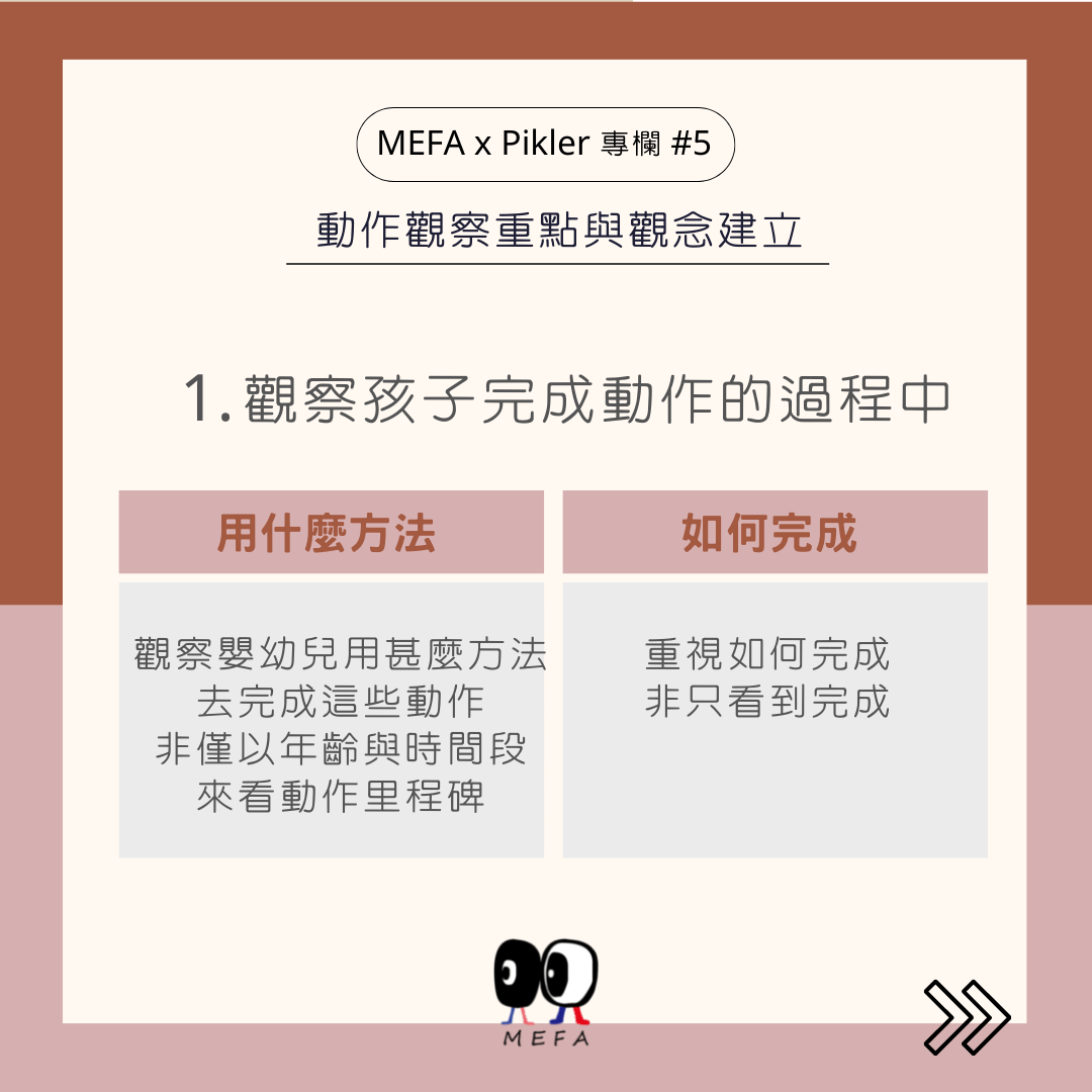 爬、坐、扶物站、獨立站、走,是運動的里程碑,是「點性」的紀錄。0-6個月會坐,非僅以年齡與時間段來看動作里程碑,而是觀察嬰幼兒用甚麼方法去完成這些動作,注意的是 #運動質量發展。 3個月俯臥,6個月坐起,注意幼兒的情緒,開心嗎?快樂嗎?連續性做了甚麼?自己做了甚麼?非只看到完成,而是重視如何完成。依幼兒想完成的目的,「肌肉神經群」肌肉群的承受度,付出多少力氣,如何施力,施力方式,一個動作可持續多久,如何完成,了解肌耐力的發展,肌肉的變化。