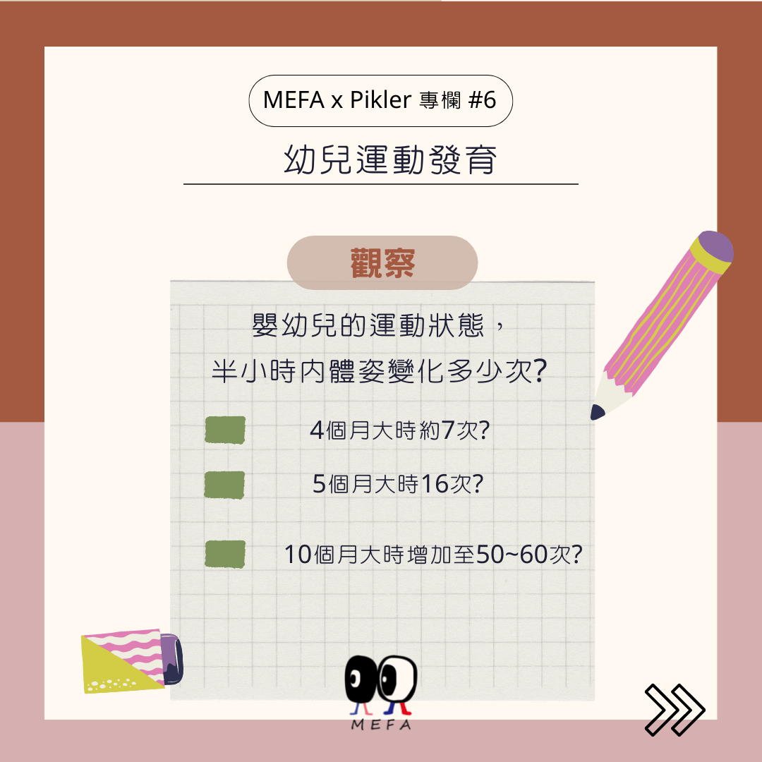 照顧者同時可以觀察嬰幼兒的運動狀態,在不參與、不引導的情況下,能否有喜歡積極的運動狀態,能保持多久(持久度的長短),半小時內體姿變化多少次?四個月大時約七次,五個月大時十六次,十個月大時增加至五十到六十次.動作越熟練體姿變化越快,連續變換動作,積極運動。一個真正自由的幼兒坐通常無法超過五分鐘,在運動過程中幼兒會注意周遭環境安全,八個月大幼兒扣除吃和睡,每天會經歷上千個動作變化。