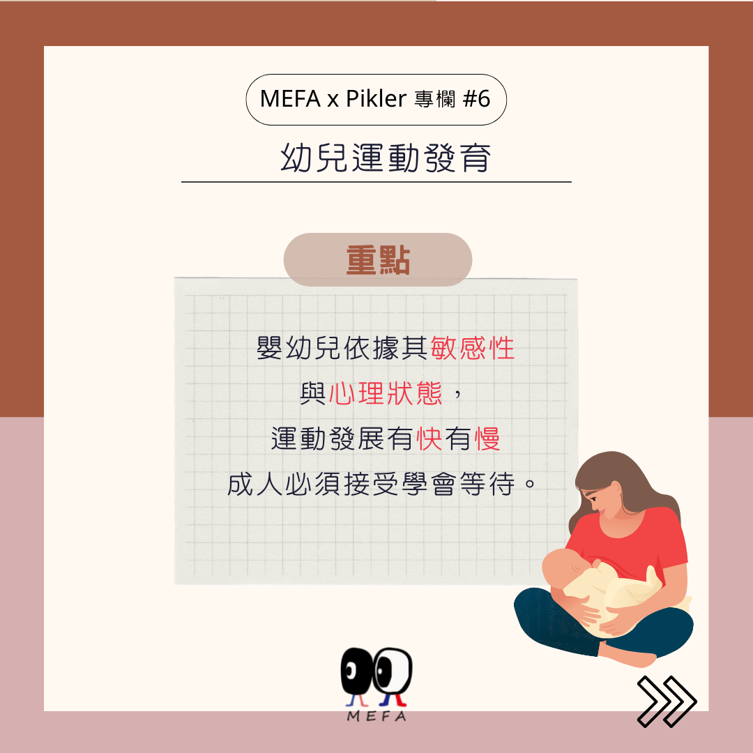 嬰兒從基礎姿勢不需要任何幫忙下,達到獨立行走的發展,精練翻趴、肘爬到匍匐爬必須經歷重心上升,頭部平衡的肌肉發展與感受後達成,與接著的運動、站、扶物走,獨立行走一樣中間都有許多的過程。運動發展有快有慢,平均值只是參考,都必須依據嬰幼兒本身敏感性與心理狀態來決定,大人必須接受學會等待。皮克勒寶寶的站起時間比其它發展數據顯示的都慢些(爬行和翻轉的空間不夠時,會迫使孩子站立,環境非常重要)。