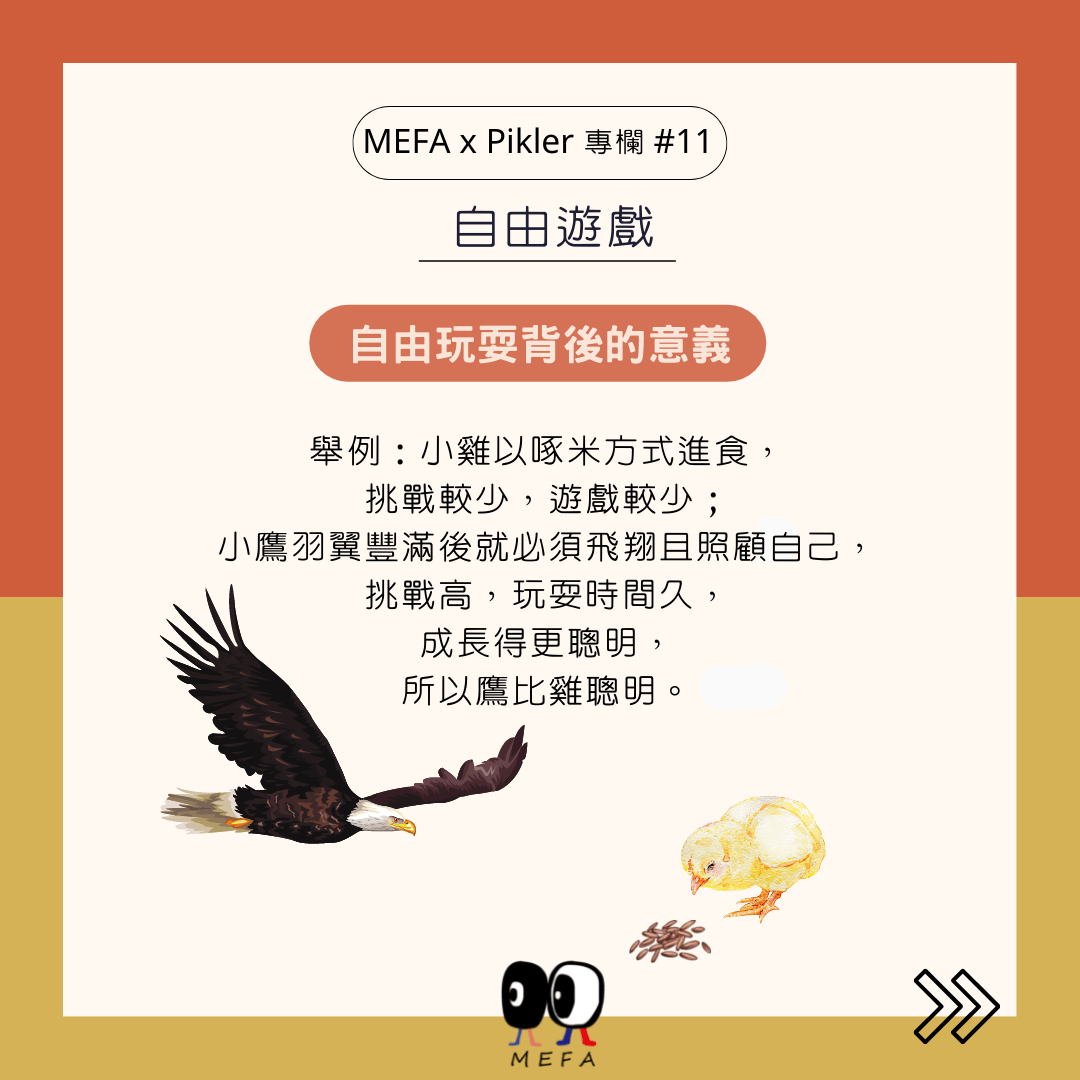 再以動物為例子,狼、狗幼獸之間以群架遊戲玩耍,精鍊獵食的知識與能力,任何一種玩耍都是學習。eg小雞以啄米方式進食,挑戰較少,遊戲較少;小鷹羽翼豐滿後就必須飛翔且自己照顧自己,必須有許多的自我玩耍,玩耍時間久,鍛鍊複雜的動作發展,成長得更聰明,所以鷹比雞聰明。
