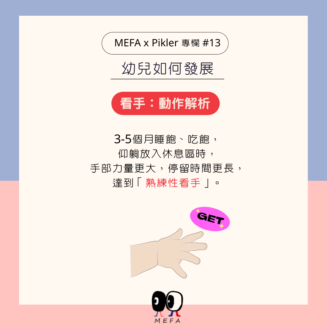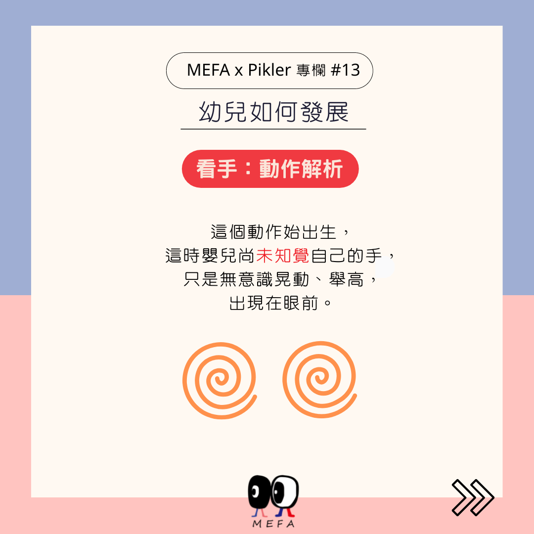 - 看手(watching the hands)。始出生,孩子尚未知覺自己的手,無意識晃動,舉高,出現在眼前。