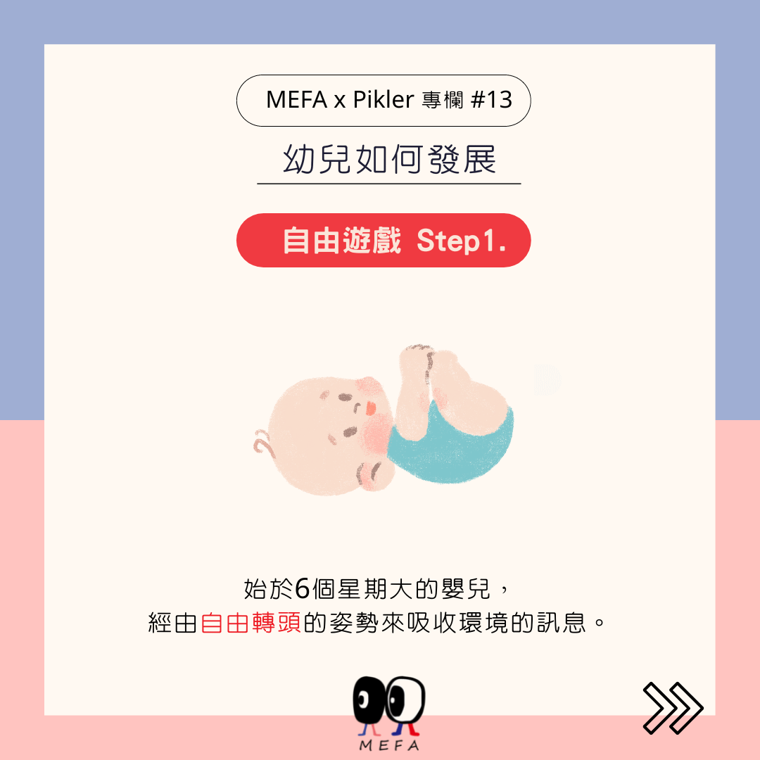 - 自由遊戲的第一步,始於6個星期經由自由轉頭的姿勢來吸收環境的訊息,此時脖子不需出很大的張力,轉動即可。
