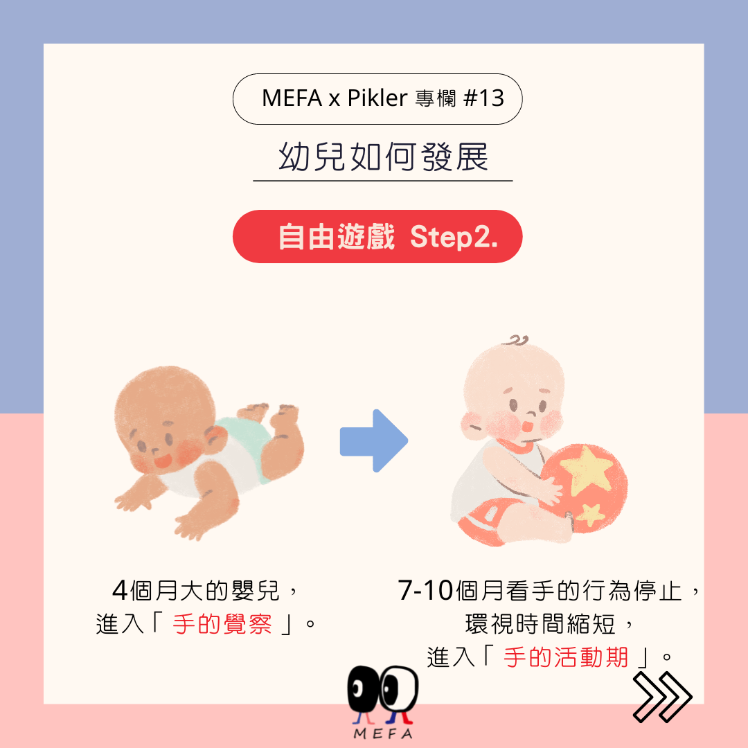 - 自由遊戲的第二步,手的覺察。4個月大的孩子醒著時平均20%時間觀察自己的手,5個月大開始觀察環境,5-7個月是環視環境高峰期,7-10個月看手的行為停止,環視時間縮短,進入手的活動期。可以從我們的附圖看見這樣的趨勢。
