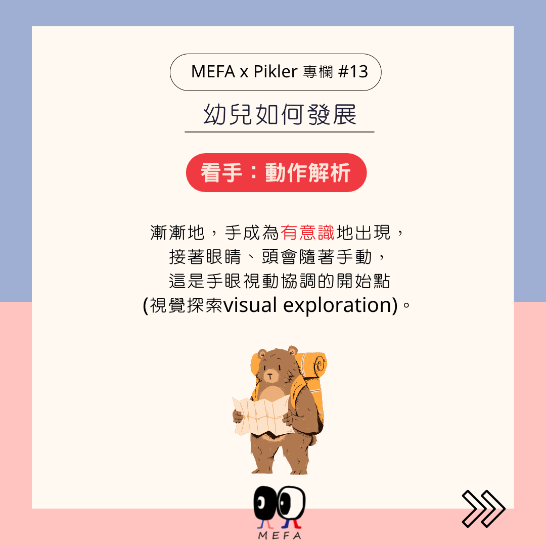 2. 漸漸手成為有意識地出現,接著眼睛、頭會隨著手動,這是手眼視動協調的開始點(視覺探索visual exploration)。一個2.5個月大小女孩,手無意識地晃入視野內,視覺開始追蹤手的擺動,隨著手臂力道的成熟後,手開始可以穩定的在眼前保持一段時間。可以開始有意識地將手停留在視線內而不需去轉頭追手,在孩子仰躺在床上時,可放立起來的點點手帕,引起孩子抓的吸引力,手可以打開,動大臂,手掌開抓,手指扭動。
