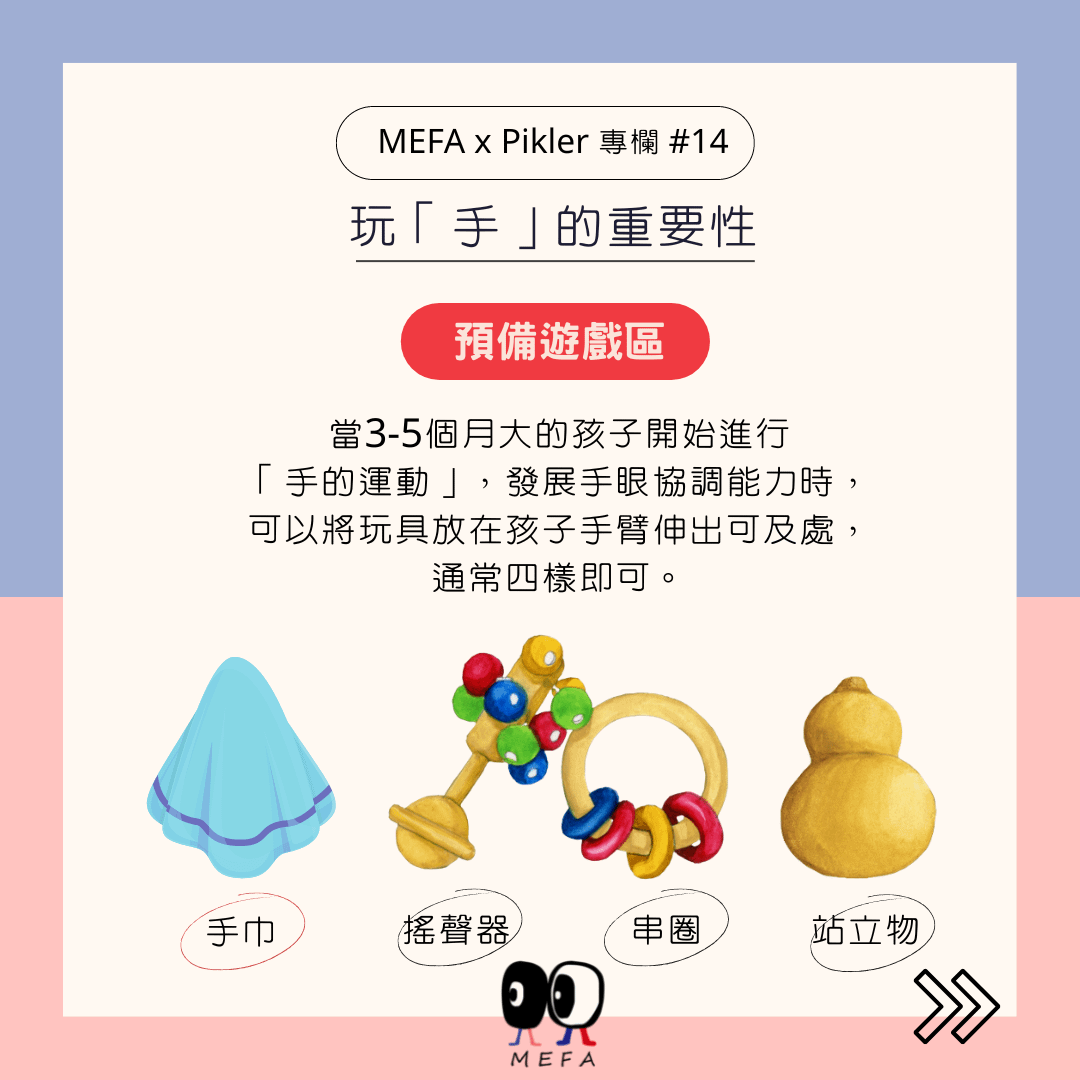 我們如何預備3-5個月大孩子的遊戲區呢?請將玩具置放在手臂伸出可及處,讓孩子的注意力由胳膊轉移至物品上,通常四樣即可,可以是
