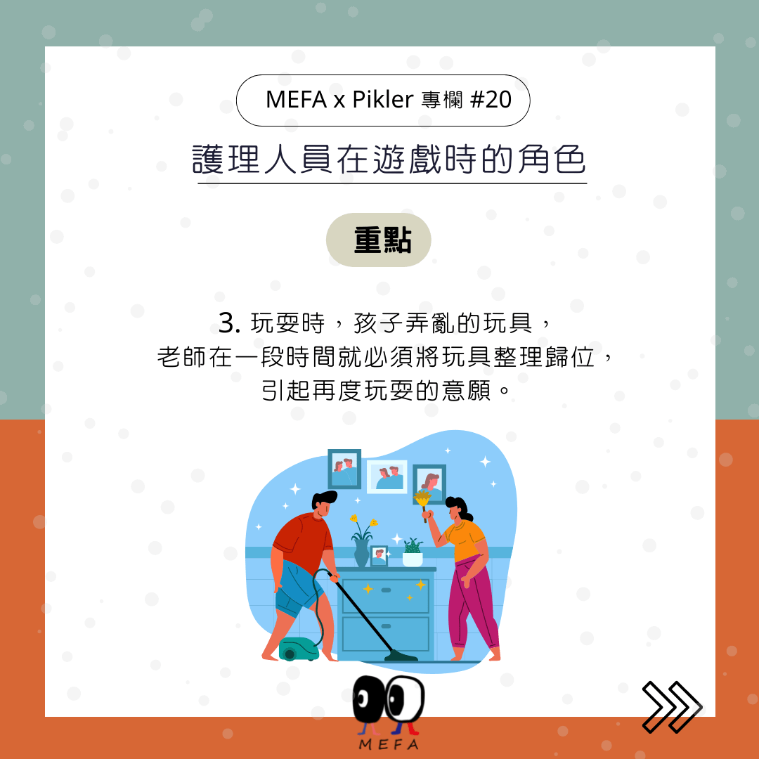 3. 玩耍時,孩子弄亂的玩具,老師在一段時間就必須將玩具整理歸位,引起再度玩耍的意願。太亂的環境無法引起孩子玩耍的意願。不會邀請或期待孩子一一整理玩具,但可接受孩子自願參與收拾,也可以邀請孩子取回成人不易收拾的玩具,依孩子意願,要不成人就自己做。
