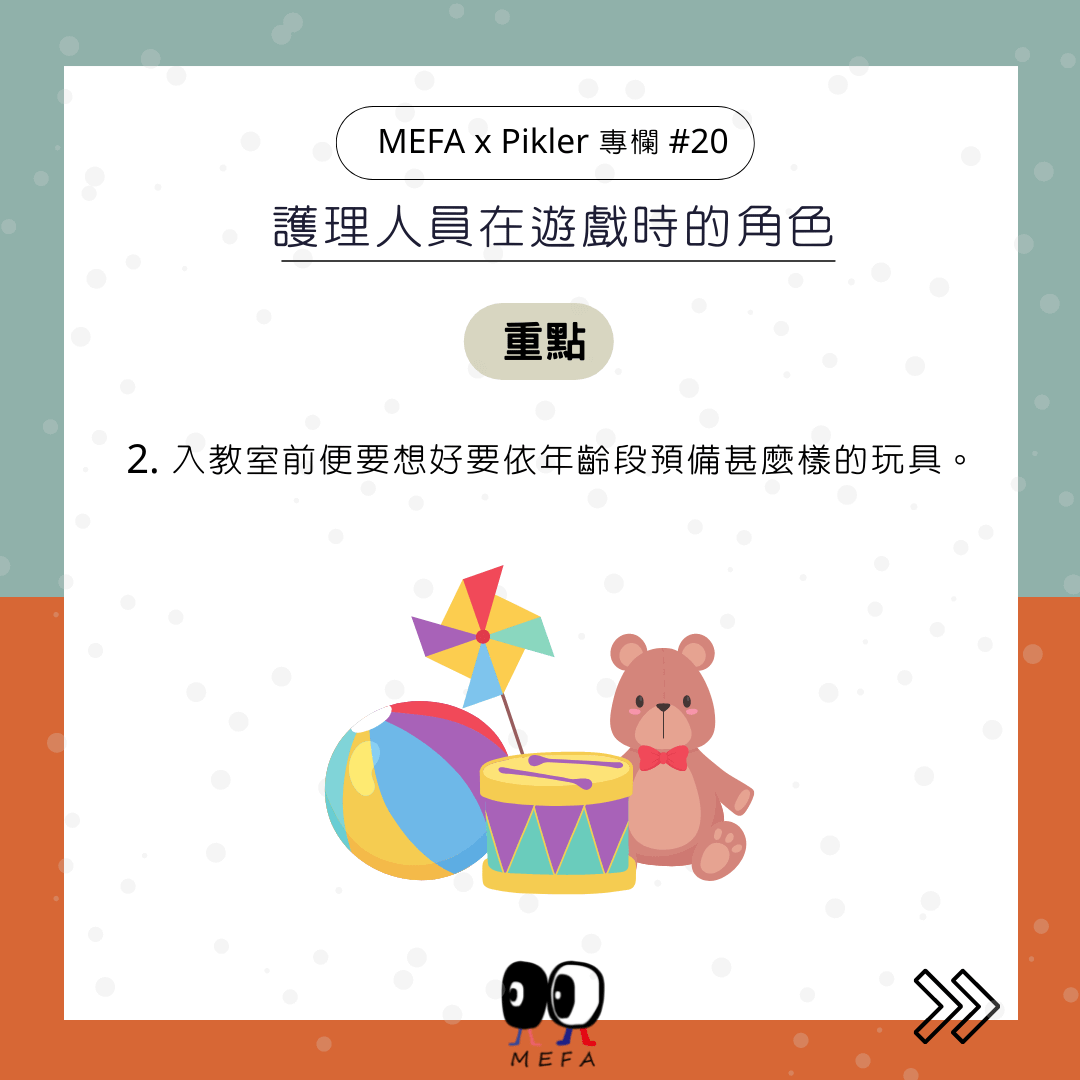 2. 準備玩具與收拾再預備,入教室前便要想好要依年齡段預備甚麼樣的玩具,有無任何偏愛,有無最受歡迎的玩具,誰最需要甚麼,依此標準來挑選。