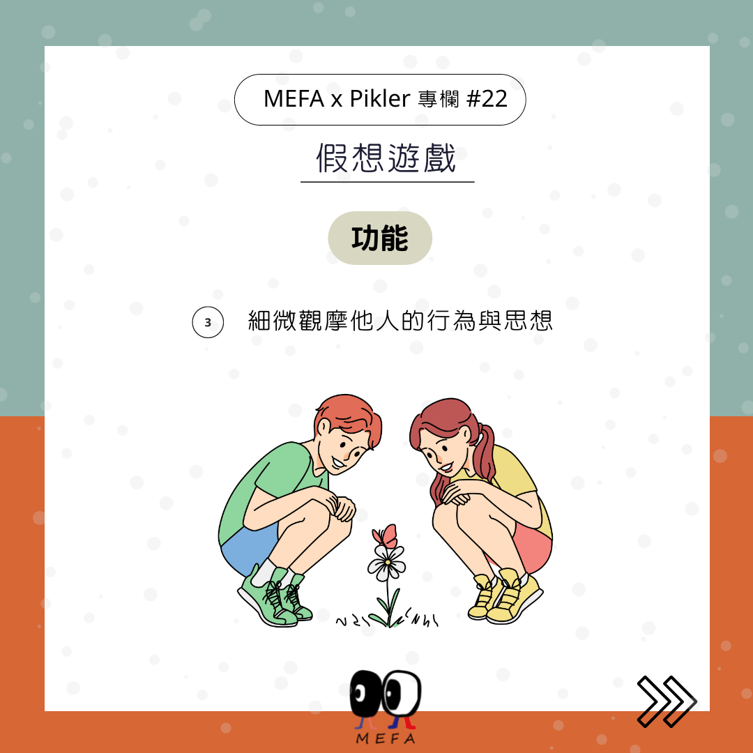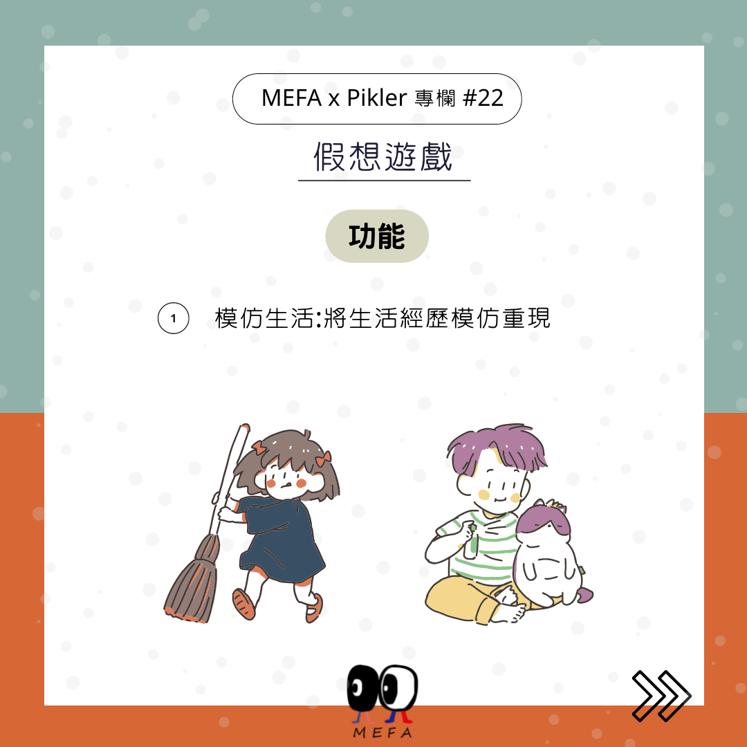 象徵性遊戲、象徵性角色扮演到假想角色扮演,是1-8歲孩子遊戲的過程。1歲左右假裝吃、吸,不存在的東西,3歲進行假扮的化妝、結帳、哄睡、打電話。角色扮演是依自己的意願發展,爸媽每天去工作,孩子每天都角色分配,發展情節與情境。